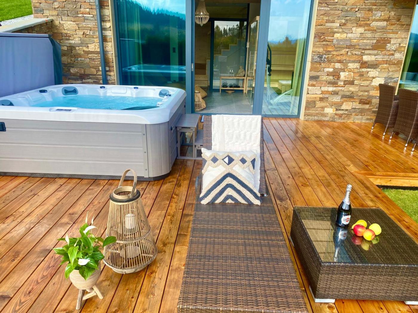 Zaplecze odnowy biologicznej obiektu Wille Mikulski obejmuje saunę i wannę z hydromasażem.