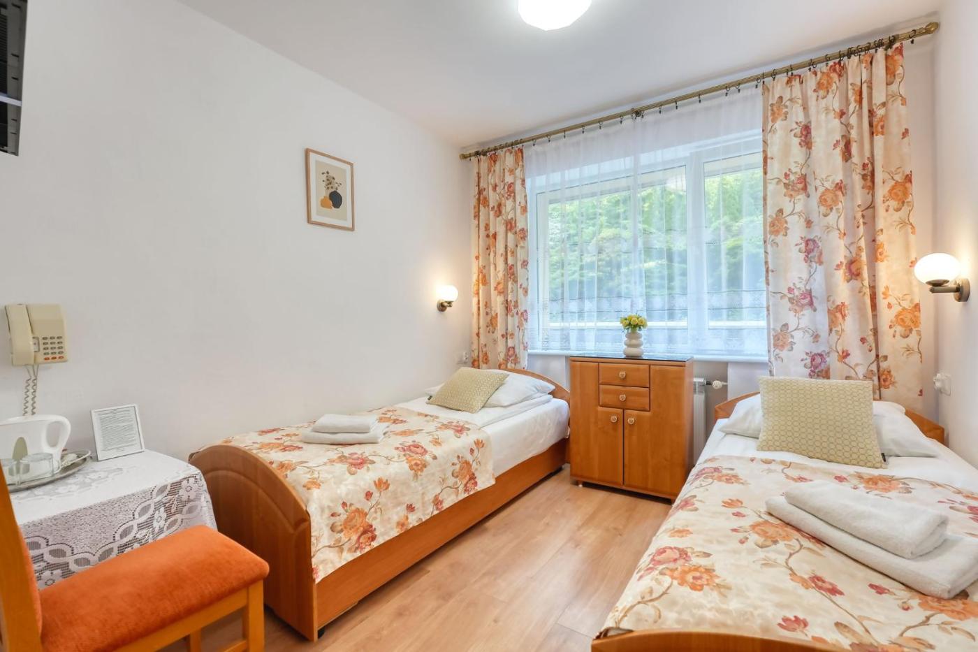 Mały pokój z 2 łóżkami pojedynczymi. The twin room offers a wardrobe, an electric kettle, as well as a private bathroom featuring a shower and a hairdryer. This twin room provides heating and a flat-screen TV. The unit offers 2 beds. Pokój z 2 łóżkami pojedynczymi - 2 osobowy. Powierzchnia pokoju ok.: 14 mkw. ;